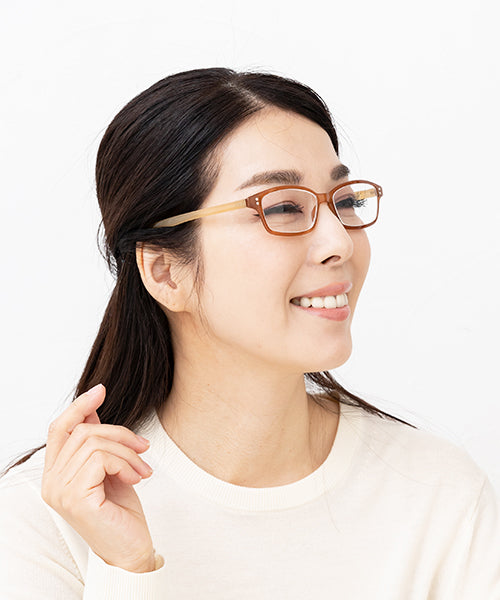 テンプル部分はバネ式のため首に掛けやすく、フィット感があります。フレームは、お顔をすっきりと見せてくれるスタンダードなスクエアタイプで、どなたにも似合いやすいデザインです。程良い大きさで本を読む時もフレームが視界を邪魔せず快適です。ポリカーボネート製かつ軽量設計により軽やかな掛け心地に。